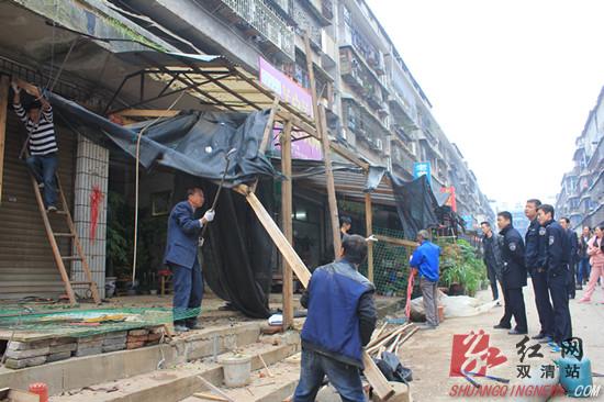 红网双清站11月17日讯(分站记者 张雪珊) 11月17日,湖南邵阳市双清区东风路街道办事处联合区城管局开展集中整治行动,对花鸟市场70余处违规乱搭棚架陆续实施拆除,总面积达2000平方米。