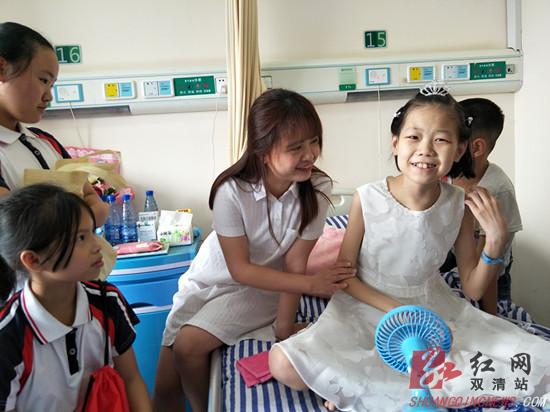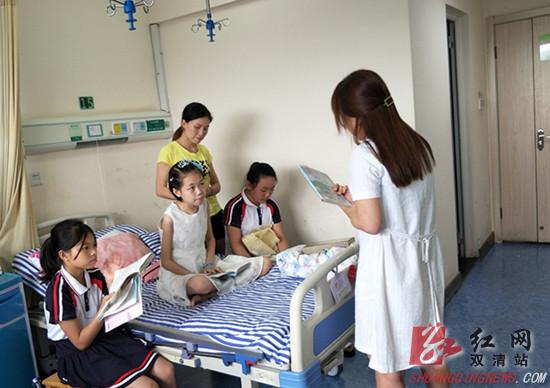 双清区五里牌小学老师罗海韵为羽羽在病房上了一堂特殊的爱心课