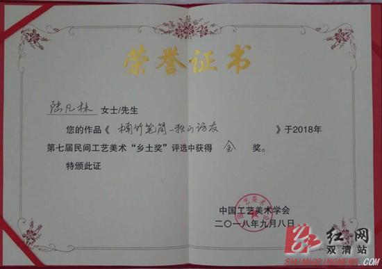 红网双清站9月10日讯(通讯员 谢青海)9月8日,2018年第七届民间工艺美术“乡土奖”评选结果在云南省剑川县揭晓,邵阳市宝庆竹刻国家非物质文化遗产项目传承人、湖南省高级工艺美术师、湖南省工艺美术大师陆凡林创作的楠竹异形笔筒《秋山访友》喜获金奖;宝庆竹刻国家非物质文化遗产项目传承人、湖南省高级工艺美术师、湖南省工艺美术大师张交云创作的竹雕笔筒《竹解虚心是我师》获铜奖。