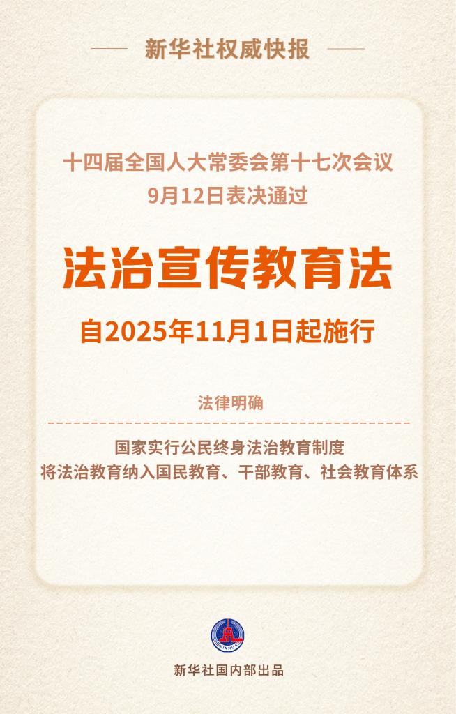 9月12日,十四届全国人大常委会第十七次会议表决通过了《中华人民共和国法治宣传教育法》,自2025年11月1日起施行。